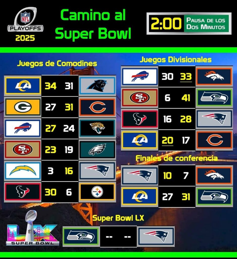 En repetición del Super Bowl XLIX los Halcones Marinos de Seattle enfrentarán a Patriotas de Nueva Inglaterra para disputar el trofeo Vince Lombardi el domingo 8 de febrero.