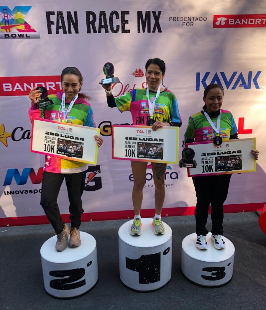 Liliana Arzola Díaz fue la triunfadora de la rama femenil en la carrera organizada por la NFL México con motivo del Super Bowl LX. En Segundo lugar quedó Brenda Carina Hernández Zárate. y en tercer sitio Evangelina Prado Márquez. Foto cortesía de la oficina de NFL México