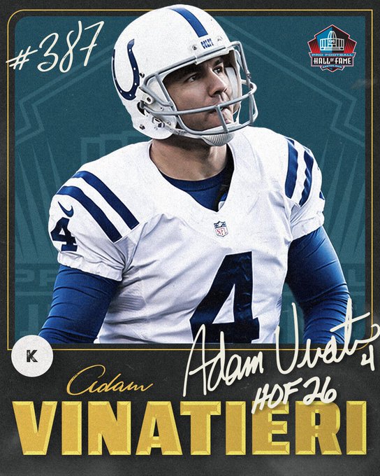 El tercero de los nuevos inmortales es Adam Vinatieri, ex pateador de goles de campo que ganó 3 Super Bowls con Patriotas de Nueva Inglaterra (XXVI, XXXVIII y XXXIX y luego la edición XLI en que formó parte de los Potros de Indianápolis que vencieron 29-17 a Osos de Chicago. En 365 juegos de campaña regular durante 24 temporadas, Adam Vinatieri concretó 599 goles de campo de 715 intentados y logró 874 puntos extra de 898 que pateó.
