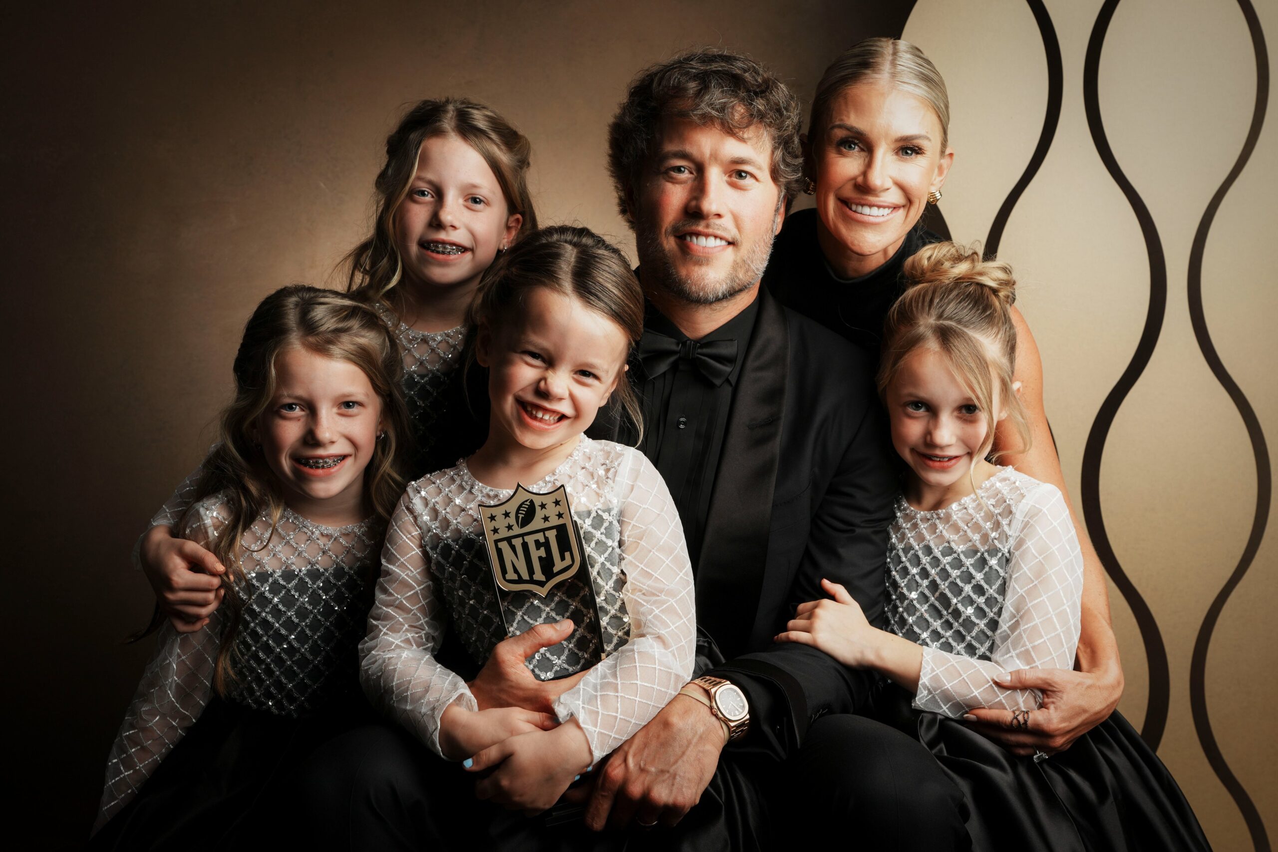 Matthew Stafford, feliz junto a su esposa y sus hijas después de ser galardonado como el Jugador Más Valioso de la temporada 2025. Foto tomada de las redes sociales de NFL.